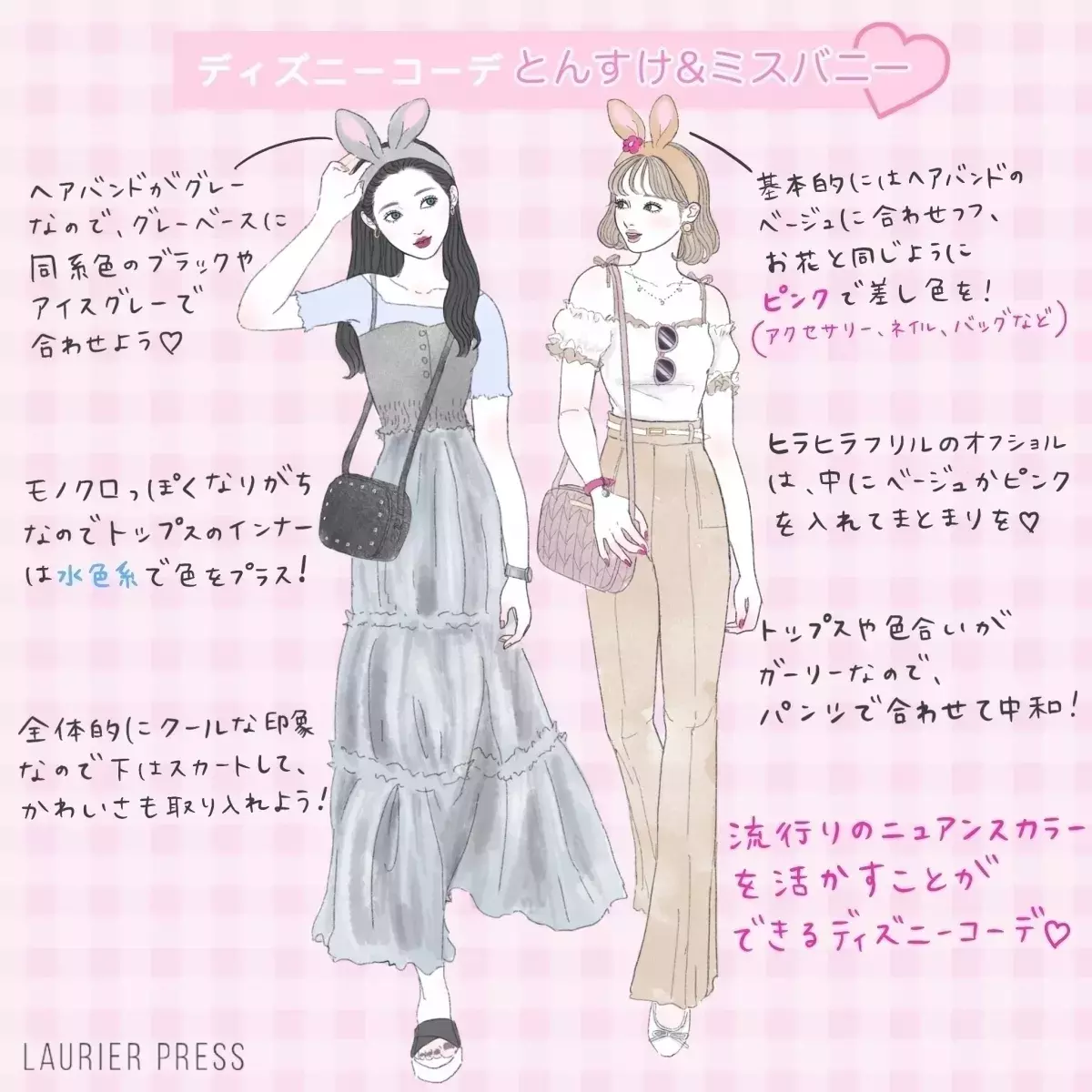 ディズニーでお友達とリンクコーデを楽しもう この夏おすすめなディズニーコーデ イラスト ローリエプレス